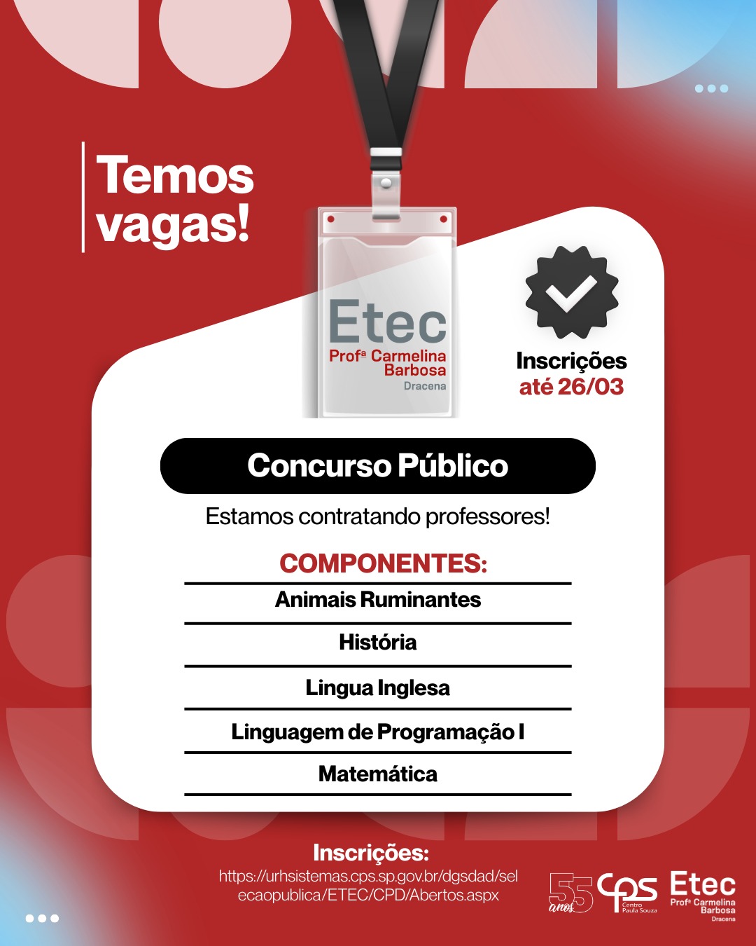 A Etec Profª Carmelina Barbosa está com inscrições abertas para o Concurso Público de Professores. Esta é uma excelente oportunidade para profissionais que desejam atuar na educação pública, compartilhar conhecimento e contribuir para a formação de novos profissionais