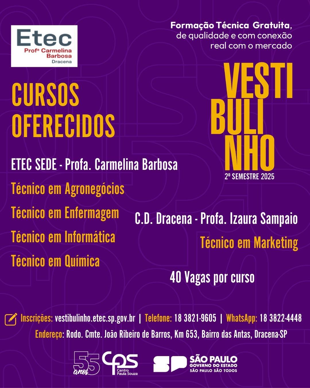 A Etec Prof.ª Carmelina Barbosa, de Dracena, está com as inscrições abertas para o Vestibulinho do 2º semestre de 2025. Esta é a oportunidade para quem deseja se qualificar, conquistar uma formação técnica de qualidade e se destacar no mercado de trabalho.